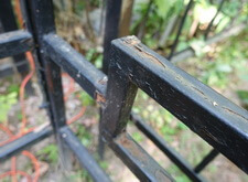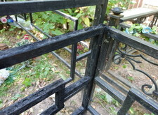 Последовательность работы стандартная. Во-первых, сжечь старую краску, во-вторых, зачистить ограду до металла, после покрыть грунтом чистый металл и покрасить черной краской. После покраски убраться на могиле. Далее на фото обожженная краска на ограде.